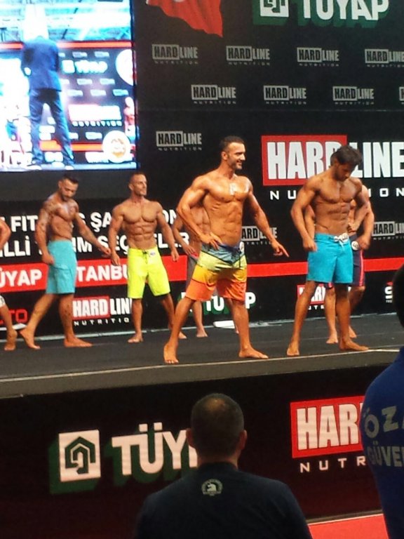 herkese tekrardan selamlar...evet arkadaşlar yarışma hikayemiz Allahın izniyle kazasız belasız bitti. cumartesi günü ilk podyum bizimdi yaklaşık 14 saatlik susuzlukla birlikte son tartıda 68kg çıktım sabah. küçük bir kahvaltı sonrası 7 gibi tuyaptaydık...podyum arkasında yaşananlar çok acayip şeyler aslında ama bir o kadar zevkli ve heyecanlı zamana karşı yarış var....bir yandan boyanmak bir yandan pump olmak bir yandan da yükleme yapmak derken bir bakmışsın podyum dasın onlarca insan türbinde seni izliyor...gerçekten o sahneye çıkıldığında alınan haz heyecan başka bir şeyle tarif etmek mümkün değil. ben son 1 haftasının kabus gibi geçtiği bu diyet döneminde bir daha asla böyle bir müsabaka hazırlığı yapmayacağımı kendi kendine söylerken...bugün seneye eylüle derece için kendime hedef koyar hale geldim :) . etrafınızda size destek verenler oldukça iş daha katlanası ve güzel oluyor gerçekten...atletik fizik kategorisi şampiyonanın maalesef en kalabalık kategorileriydi...hatta gençler de bir boy grubunda 75kişi podyuma çıkanlar oldu, şaka gibi. mesela pazar günkü klasikte -171 kategorisinde toplam 7 kişi vardı ilk 6 zaten final demek. ben ise -170 büyük erkeklerde idim 23 kişi ile podyuma çıktım...ve ilk kez katılan sadece iki kişi vardık. bu arada en yaşlı bendim :) birde bir arkadaş vardı. diğer rakiplerin hepsi 25-30 yaşında genç arkadaşlardı...ilk 5 kalan arkadaşlar son 3 senedir o podyuma sürekli çıkan ve derece alan arkadaşlardı ve gayet tecrübelilerdi. fizik olarak da gerçekten hakkaniyetli bir finaldi. ben ise 23 kişi içinde yarı finale kalabildim ki bu benim için çok büyük bir onurdur...hemen iki dakika sonra oradan inip eve gitsem gerçekten çok üzülürdüm...podyum havasını yarı finale kadar hissettim hatta 6. finalistin yerine ufak tefek tecrübesizlikler yapmasaydım ben bile olabilirdim. buradan çok ciddi tecrübeler çıkardım, oraya giderken eksiklerimi biliyordum hatta yarışmaya girme kararını son 1.5 ay kala vermiştim. hocamda bu kısa süre zarfına elinden geleni yaptı benim için ve bu kadar kısa sürede yarı finale çıkabilmek beni çok motive etti ve gelecek için hırslandırdı. artık seneye nerede nasıl olacağımı nasıl bir hazırlık takvimi gerektiğini çok iyi biliyorum. bütün planlarımı final ve hatta derece üzerine kurguladım. yapabilir miyim ? bence evet. sahne performansı olarak hocam bile senden bu kadar sahneyi doldurabileceğini beklemiyordum dedi...bu sanırım doğuştan gelen bir yetenek :) bugün tartıda 73kg geldim...yani 4 günde 5kg aldım zaten çoğu su kaybıydı...kendime geldim be diyetimi koruyarak biraz vücudumu dinlendiricem...sonrası takvimi ayarlayıp seneye eylüle kendimi hazırlıycam...inşallah bu küçük anı defteri de burada kalır seneye bizde bunları okurken başka yerlerde oluruz....hepinize bu uzun yazıyı okuduğunuz için saygı ve sevgiler dilerim...son olarak bir kaç foto ile yazıyı noktalıyorum.